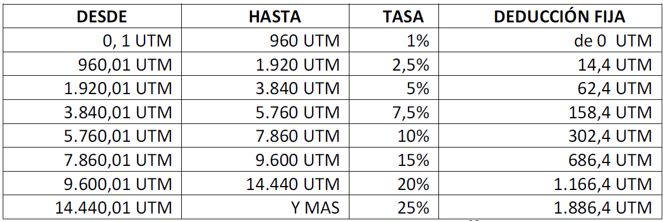 El impuesto a la herencia es un impuesto con tasas progresivas por tramos. Para poder determinar el monto del Impuesto a la herencia, se debe aplicar la siguiente tabla:
