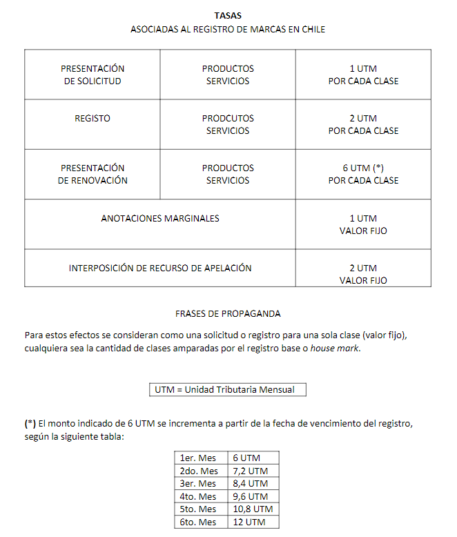 A continuación, se detallan en un cuadro las tasas establecidas para el registro de nuevas marcas en Chile.